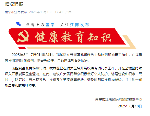 北京的新闻根据江南(Nanning City)的新闻,从2025年8月17日从0:00到24:00,我们的城市对奇肯古纳尔(Chikungununale)进行了积极监控,并在富士Yuan街上发现了一个案件。患者进行温和,有效评估和治疗。为了控制基孔肯雅热的传播,我们的城市已经在相关地区进行了特殊的对蚊子媒体的消毒,而民族主义卫生运动正在整个城市继续进行。在这里,建议大多数居民积极采取个人保护,清除废物和水,杀死蚊子并防止叮咬。如果您遇到诸如发烧,皮疹和联合疾病之类的症状,请准时去医疗机构,积极地告知您的旅行历史和蚊子叮咬病史。编辑Chen Yanting