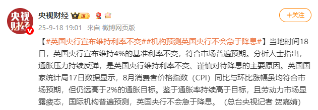 根据@CCTV的财务,在当地时间的第18个时代,英格兰银行宣布,根据市场的一般期望,它将保持4%的基准利率。分析人士指出,继续反弹通货膨胀压力是英格兰银行对削减利率保持不变和仔细谨慎的主要原因。英国国家统计局的数据在17日表明,尽管八月份消费者价格(CPI)的每年和月度上涨的增长与市场预期一致,但它高于2%的目标通货膨胀。由于通货膨胀率仍然超出目标,并且劳动力市场表现出弱点,因此国际机构通常预测,英格兰银行不会急于降低利率。 (CCTV记者He Jiajing)编辑Chen Yanting