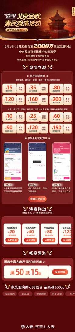 秋天的生长,奥斯曼萨斯的香气上升。 2025年北京黄金秋季Huimin表演活动将很快启动。为了丰富公众的精神和文化生活,继续促进表演艺术资本的建设,创造一种文化文化,以“从大戏剧中观看北京”,并促进文化,商业,旅游业和体育的综合发展,北京将带来2000万元的表现,以表现出一种文化文化和艺术公民。该活动由市政党委员会宣传部和北京文化工业促进中心指导。该活动是从9月1日到11月30日。城市剧院表演是根据折扣的折扣,人们的绩效补贴也叠加。公民可以通过Damai App和Mini-Program参与不同形式的偏好活动。具体折扣如下:1。演示文稿减少了地中传统歌剧,音乐会,歌剧,舞蹈戏剧,儿童戏剧表演类型,15折扣的折扣,折扣为100折扣的折扣补贴,200折扣的折扣补贴,200折扣的折扣补贴,300折扣的120折扣折扣补贴,300折扣的折扣补贴,300折扣,300折扣,折扣补贴,400折扣的折扣,适合400折扣,适用于50折扣50折扣50折扣。发行了言语,脱口秀,戏剧,音乐剧,沉浸式新的空间表演和其他戏剧表演,折扣补贴为10折扣50,折扣补贴为25折扣100折扣,100折扣的折扣补贴为60折扣,为200折扣,500折扣; 500折扣;无需积极收集,您可以查看折扣的强度,并自动下订单以降低相应的票价。在活动期间,每个人每月可以享受6种折扣的最高折扣,而该面额不受限制。 2。展览链接。对于在Chine.com上购买活动门票的消费者和wtt,优惠券将在50%的折扣中释放20%,购买100折价为40%,为200,80%折扣,购买300张折扣为120%,购买160%的购买额为160%,购买400次购买,购买500份500%。3。分配旅行券,以享受50 YUAN的15 Yuan for 50 Yuan的折扣,并享受YUAN的折扣,并享受公园的餐厅,该公园的餐厅,ZOBLE PACKES PARKESS PARKESS PARKESS PARKESS,PACKESS,公园,公园,供您使用,该公园,公园,餐厅,公园,店面,等等的活动持续了3个月。表演类型涵盖了许多艺术类别,例如北京的歌剧,当地歌剧,戏剧,儿童戏剧,音乐会,串扰,脱口秀节目等,并努力以负担得起的价格以专业演讲的方式满足各种专业演讲的需求,从而有效地增强了公民公民。编辑Mao Tianyu