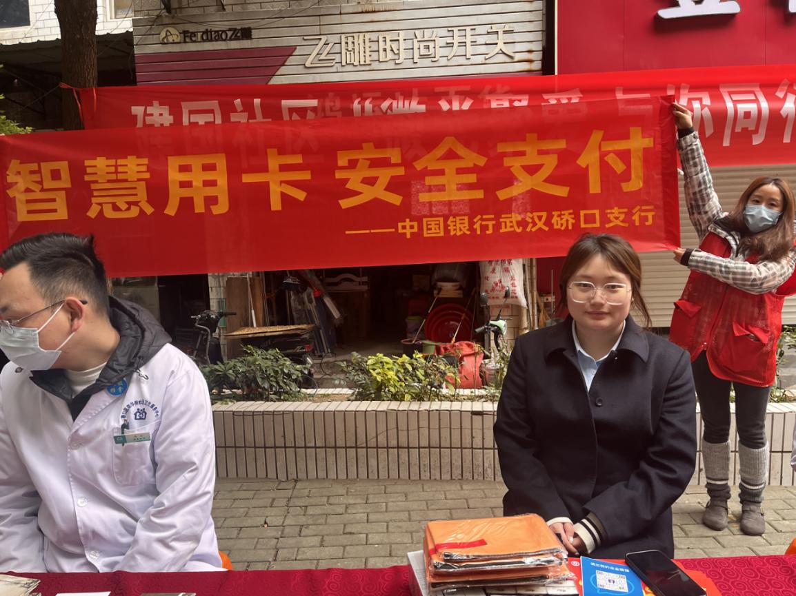 荆楚网(湖北日报)讯(通讯员 唐美娜)近日,中国银行武汉硚口支行(以下简称“中行硚口支行”)深入建国社区开展以“智能卡使用、安全服务”为主题的反诈骗宣传活动,为居民在小区门口带来专业的金融知识和便捷服务,规避风险,有效规避社区保护群众“钱袋”的风险。