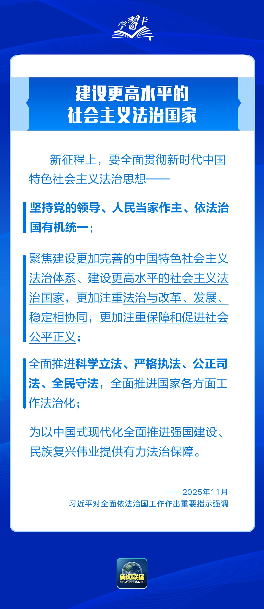 学习卡丨推动全面依法治国,总书记最新拓展 2025-11-19 11月17日至18日,中央全面依法治国工作会议在北京召开。习近平总书记对全面依法治国工作作出重要指示,强调坚持党的领导、人民当家作主、依法治国有机统一,共同开创法治中国建设新局面。制片人总监丨严帅男监制丨李哲总编辑丨王兴东剪辑&制图丨马蔚路詹星岑